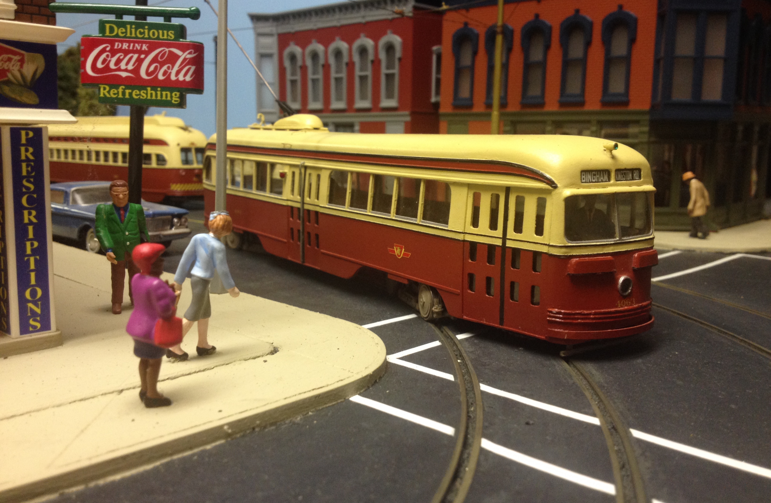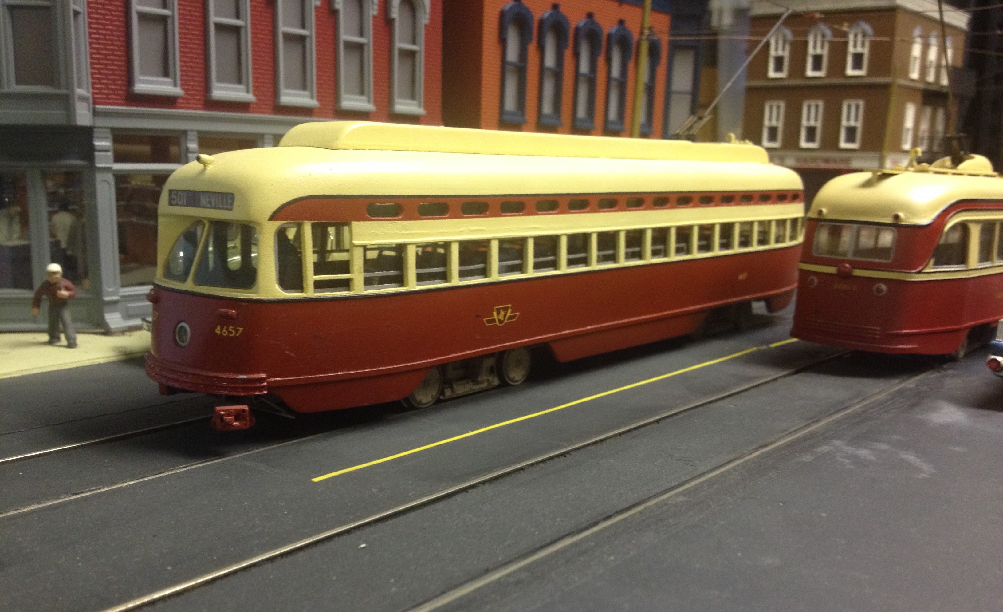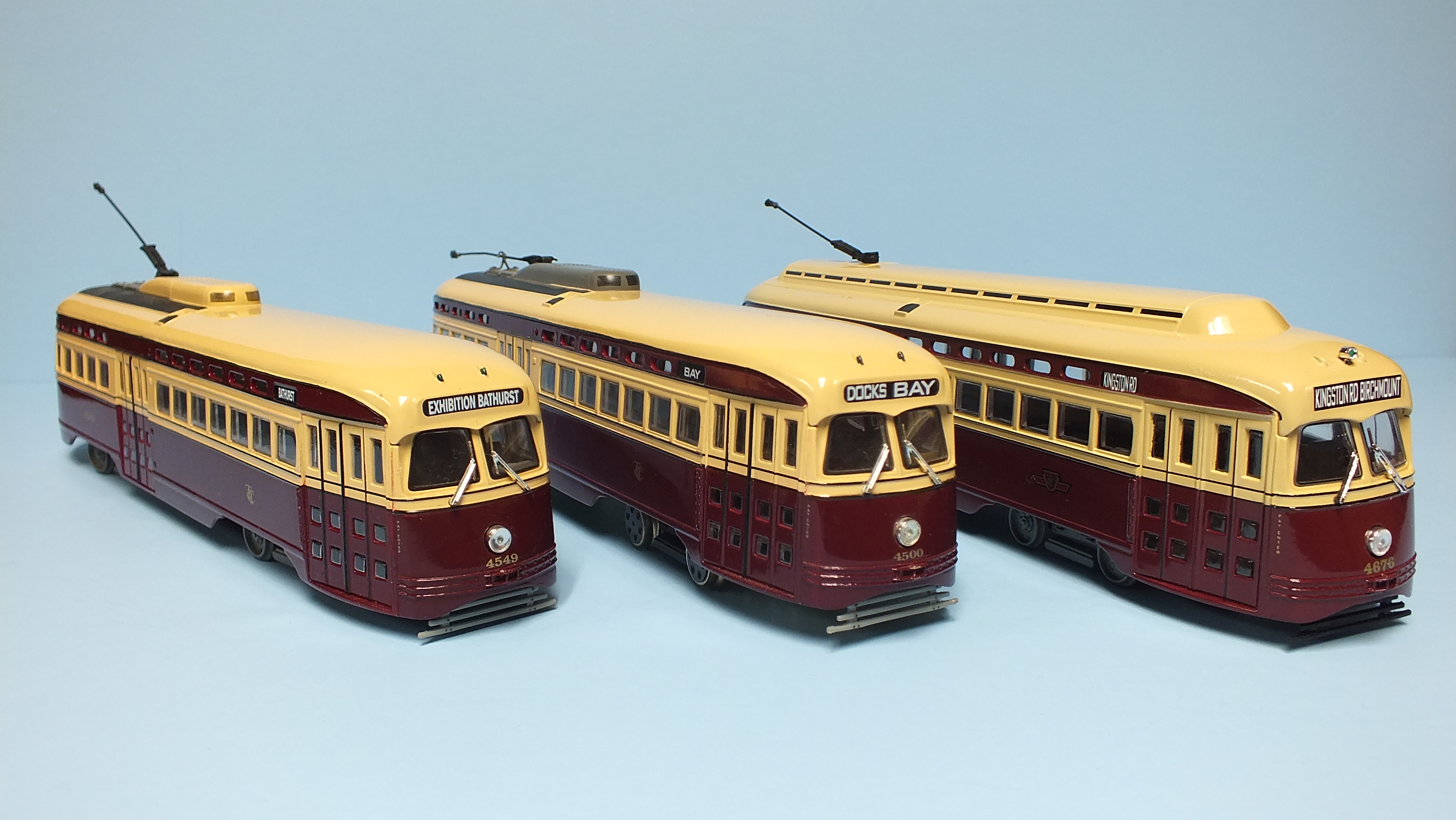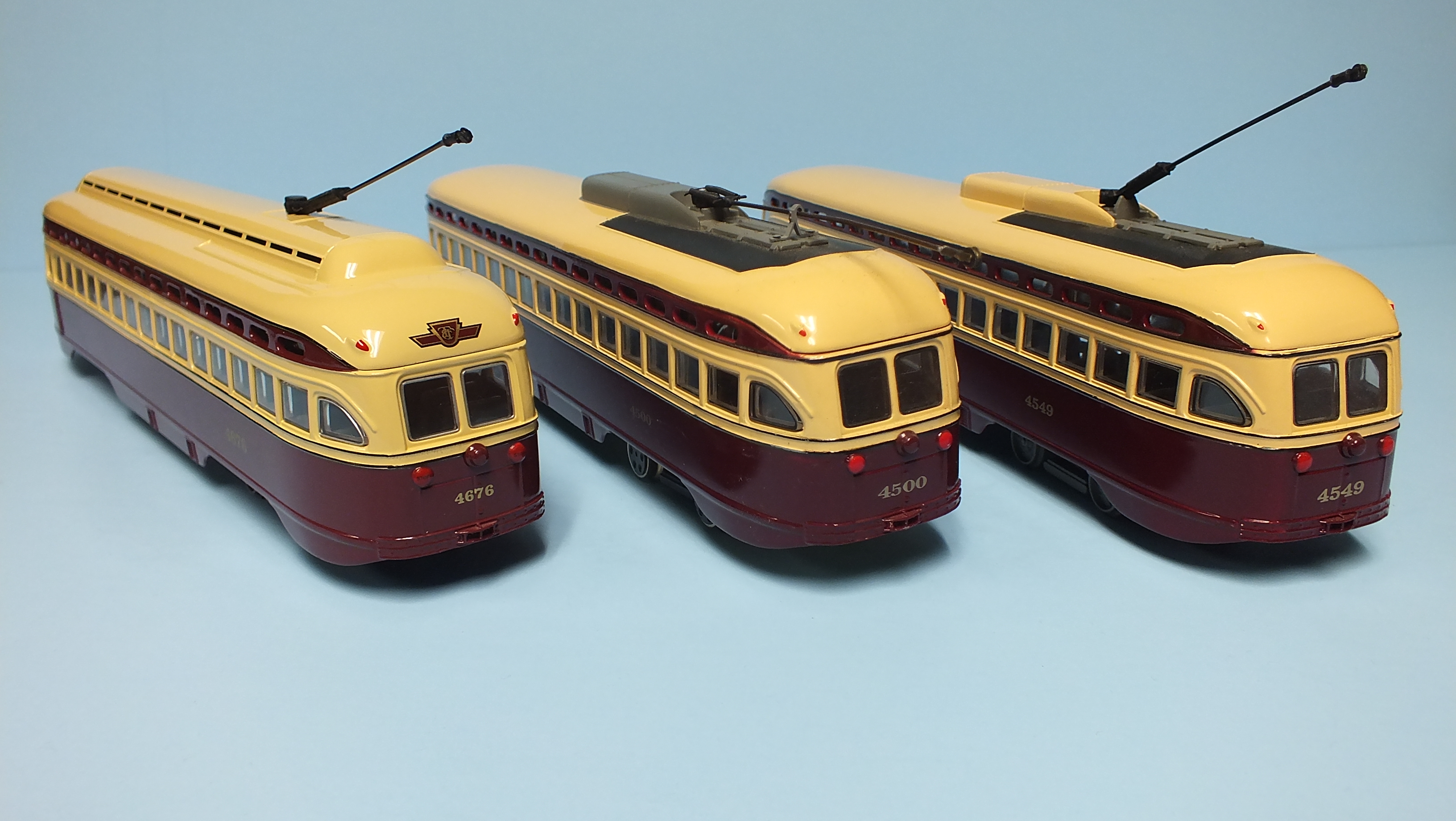 Toronto TR's in HO Scale. Each car was made from two AHM "Brill" trolleys (actually TRCo Class "F" cars)spliced together, with air doors taken from Bachmann Brill trolleys.